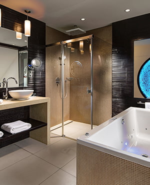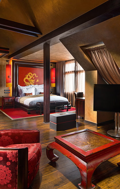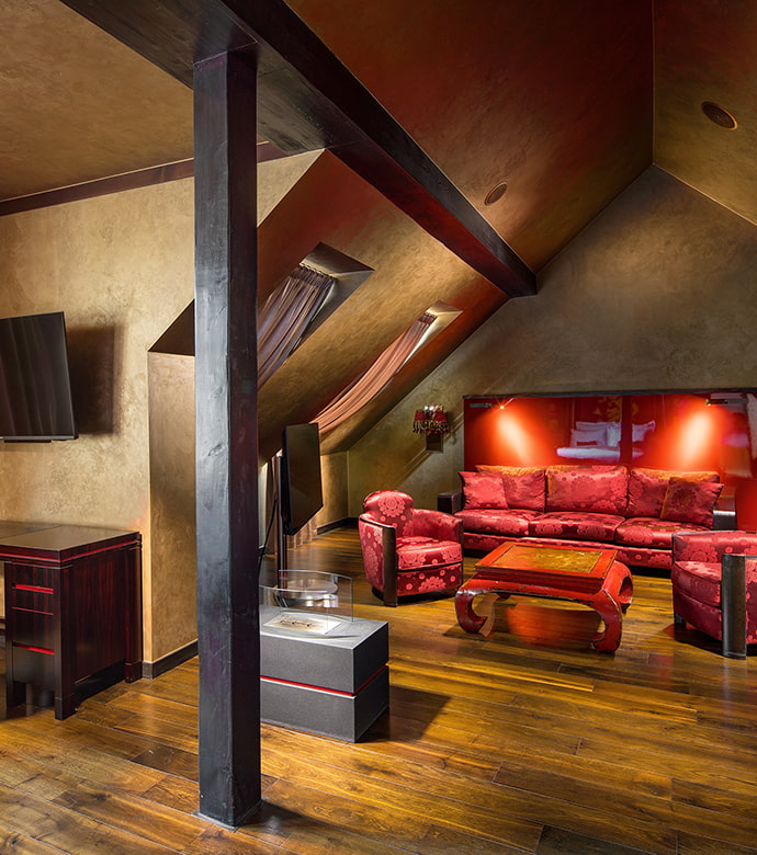 The attic rooms are connected to each other and provide the perfect place for inspiration and relaxation. While the Old Town offers unforgettable scenery outside the windows, your experience inside the suite is enhanced by the elements of fire, air and water. Which will draw your attention first - the fireplace, the deluxe attic light or the glazed passage into the bathroom?