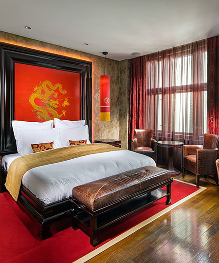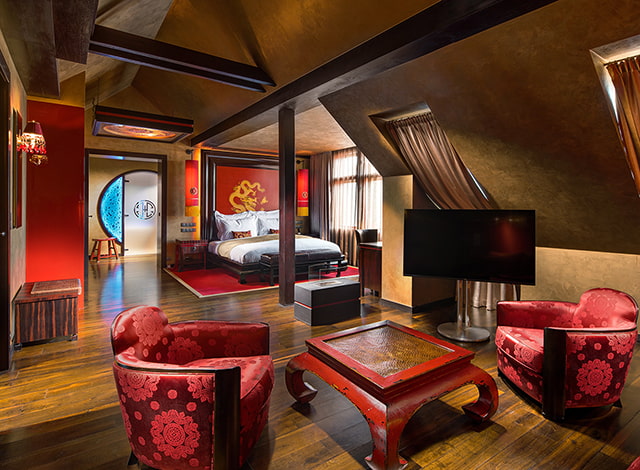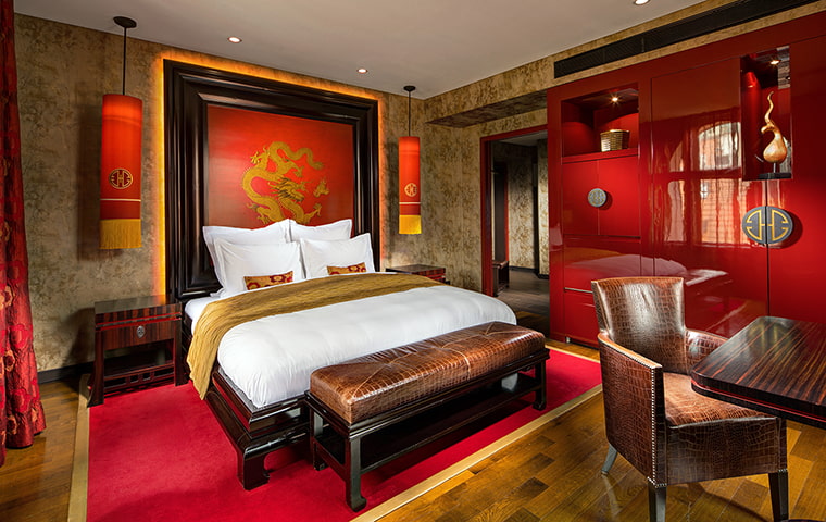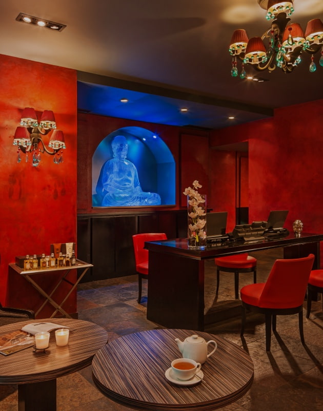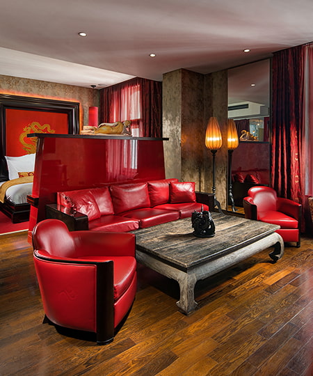 L’alliance de la philosophie asiatique et des technologies modernes offre une expérience unique. L’atmosphère originale de l’hôtel-boutique Buddha-Bar Hotel Prague est créée grâce à la présence d’éléments essentiels : La fusion du rouge et de l’or, les meubles en véritable ébène de Macassar qui entrent en contraste avec le modernisme du vernis rouge, et des éléments de décor stylés, le tout avec un fond de lumière intimiste dégagée par des lampes en verre taillé évoquant une atmosphère de séduction.